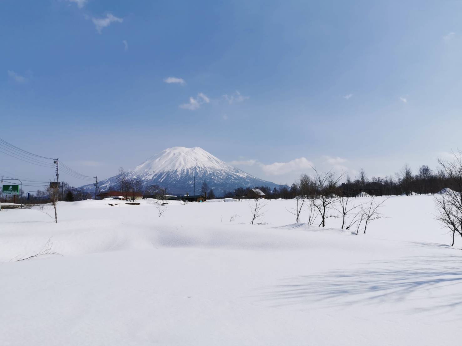 A dynamic, unobstructed view of Mount Yotei with no power lines, captured from ground level.電線に遮られないダイナミックな羊蹄山の景色。地面より撮影。