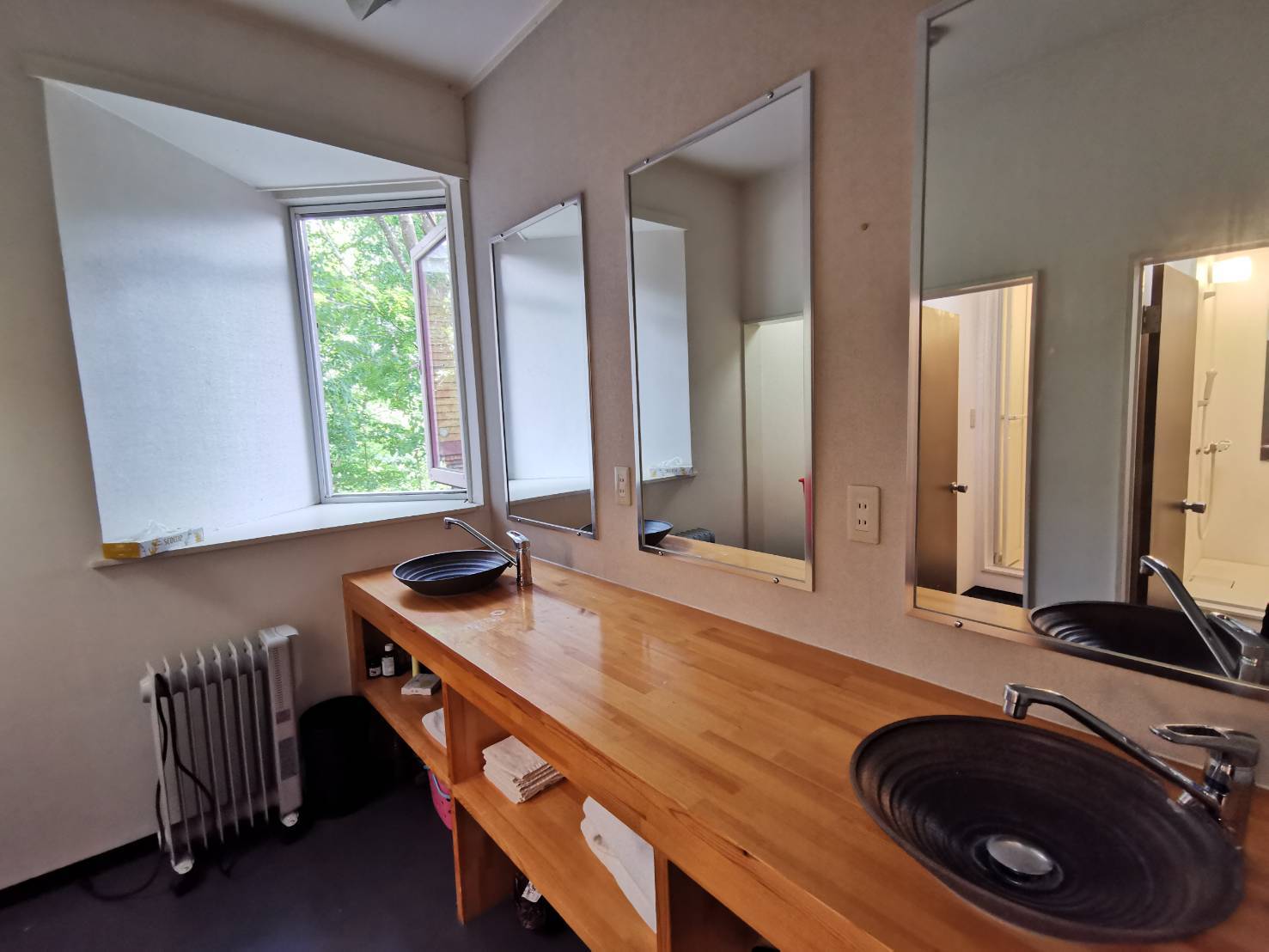A spacious vanity area with beautifully designed windows. ゆったりとした洗面台スペース。窓のデザインが素敵です。