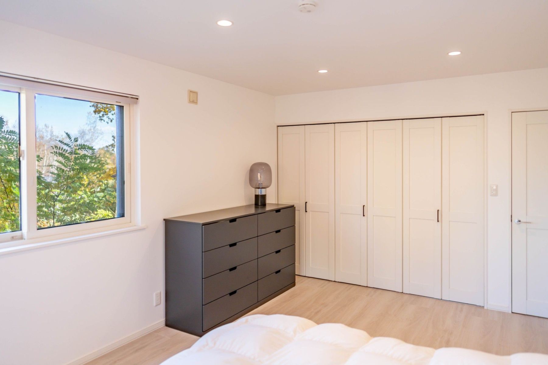 A clean and tidy bedroom with spacious storage.スッキリとした寝室。広々とした収納スペース。