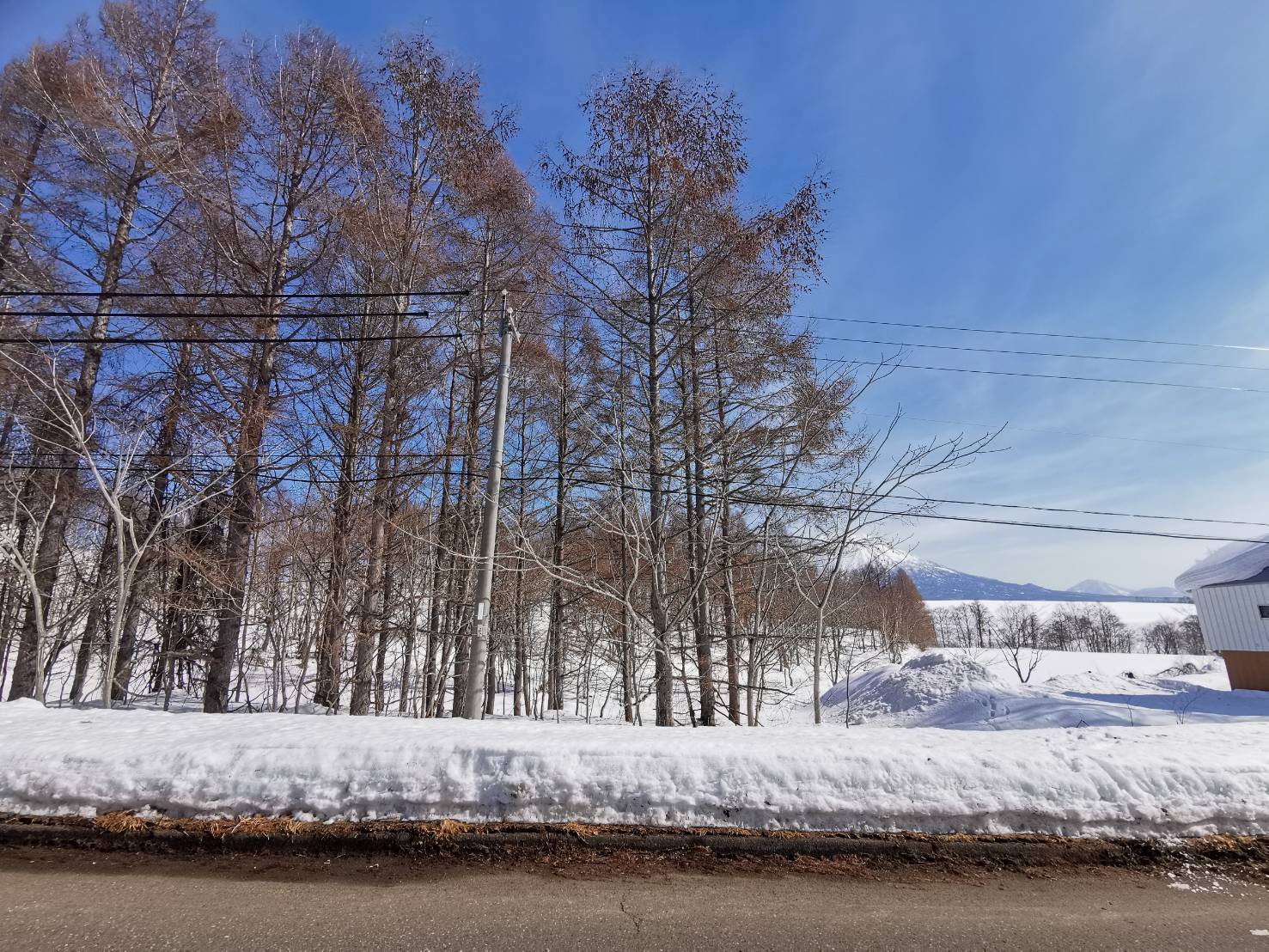 Photographed from the front of the land. The frontage road is a town road with free snow removal, and its wide entrance ensures easy access. 土地の正面より撮影。前面道路は町道で除雪が無料。間口も広いので土地へのアクセスも容易。