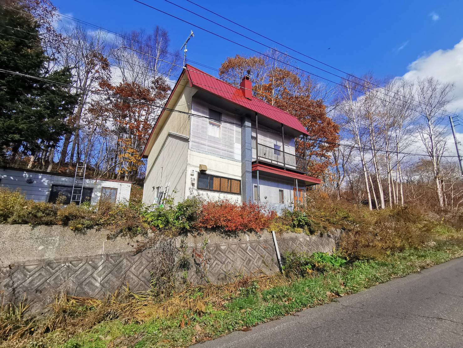 The house sits higher than the road, and the steep slope behind it provides natural privacy.
