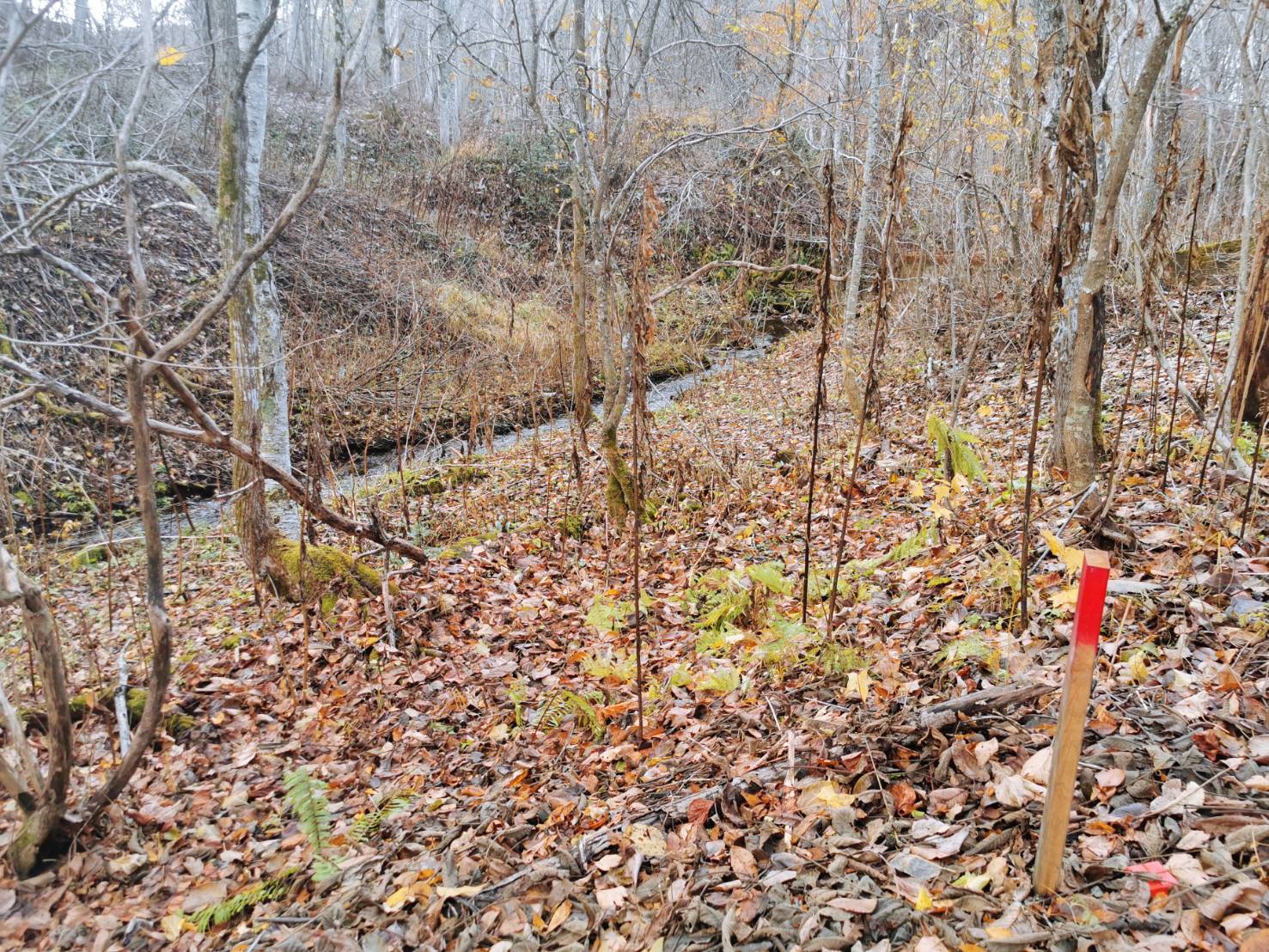 A small stream runs along the boundary of the land, and the sound of the water brings a soothing sense of calm. 土地の境界にある小川。せせらぎの音に心身が癒されます。