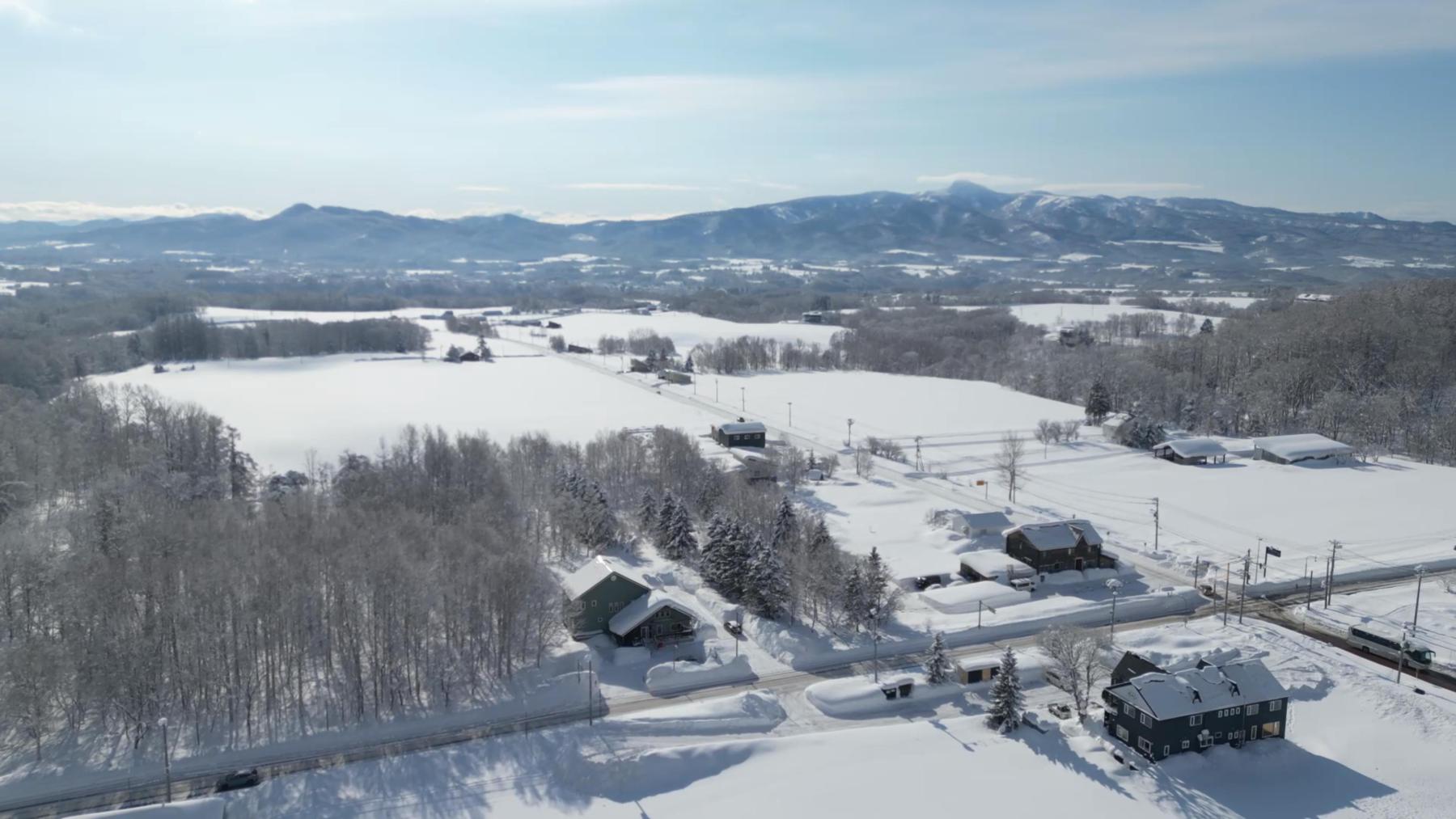 The farmland in front preserves expansive ski resort views, while the forest behind ensures privacy. 目の前の畑はスキーリゾートの雄大な景色を保全してくれます。家の裏手には森があり、プライバシーが確保されています。
